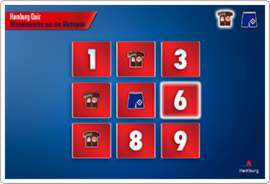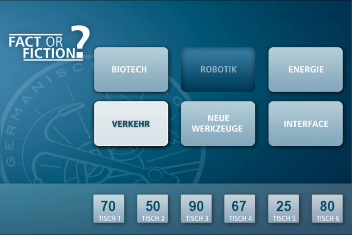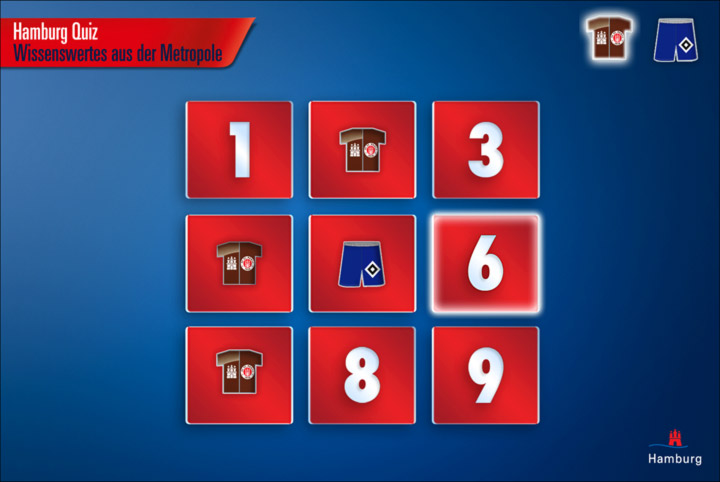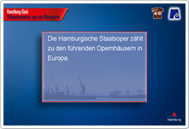 Die Quizfragen sind auf den jeweiligen Anlass bezogen. Bei einer falschen Antwort wird anschließend die richtige Antwort auf dem Screen ausgegeben. Einen zusätzlichen Reiz gewinnt das Spiel dadurch, das die Fragen aus einem Feld nach den Regeln von "Drei gewinnt" gewählt werden müssen. Das Spiel kann sowohl moderiert auf Veranstaltungen als auch als selbständiges Programm auf Terminals eingesetzt werden.